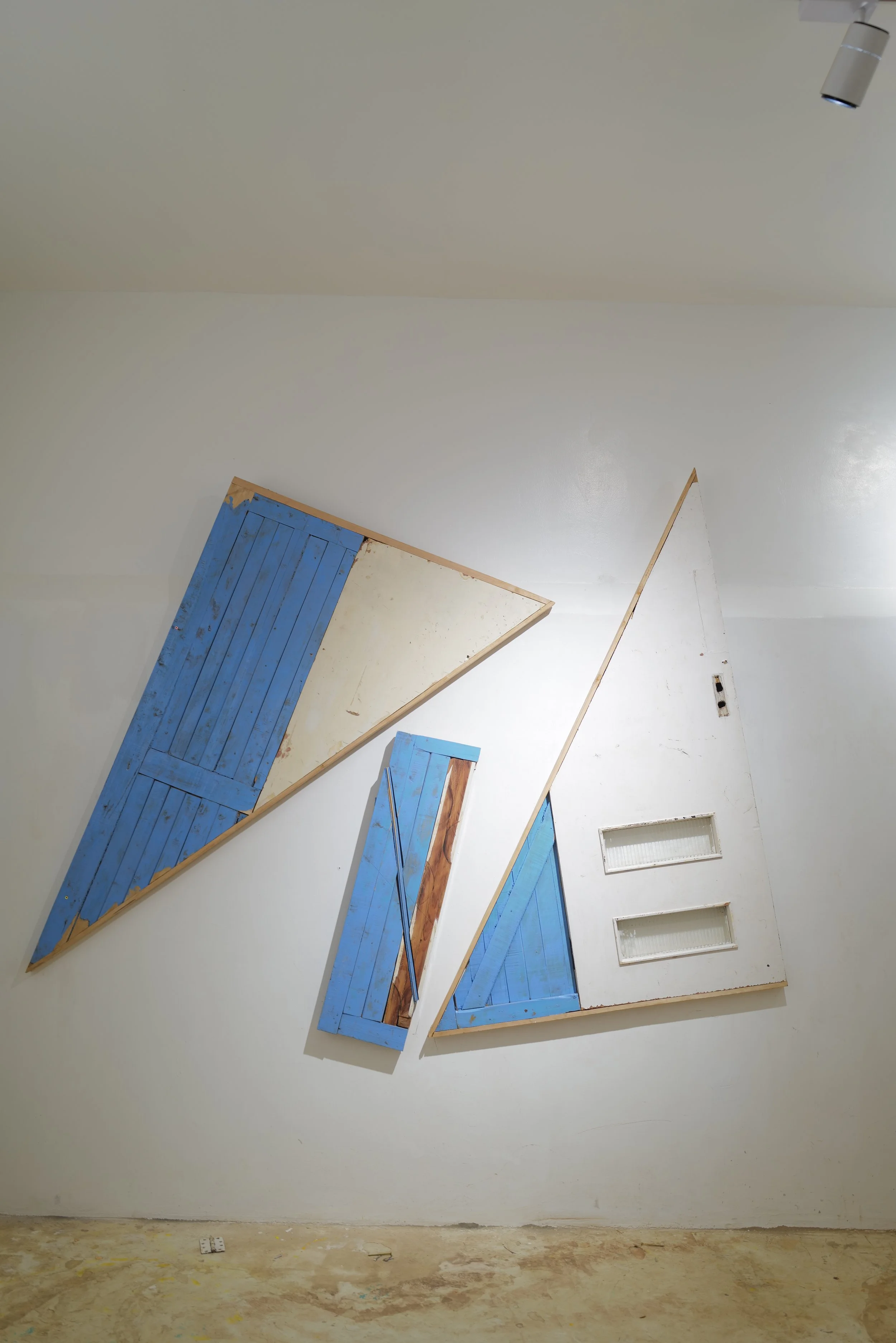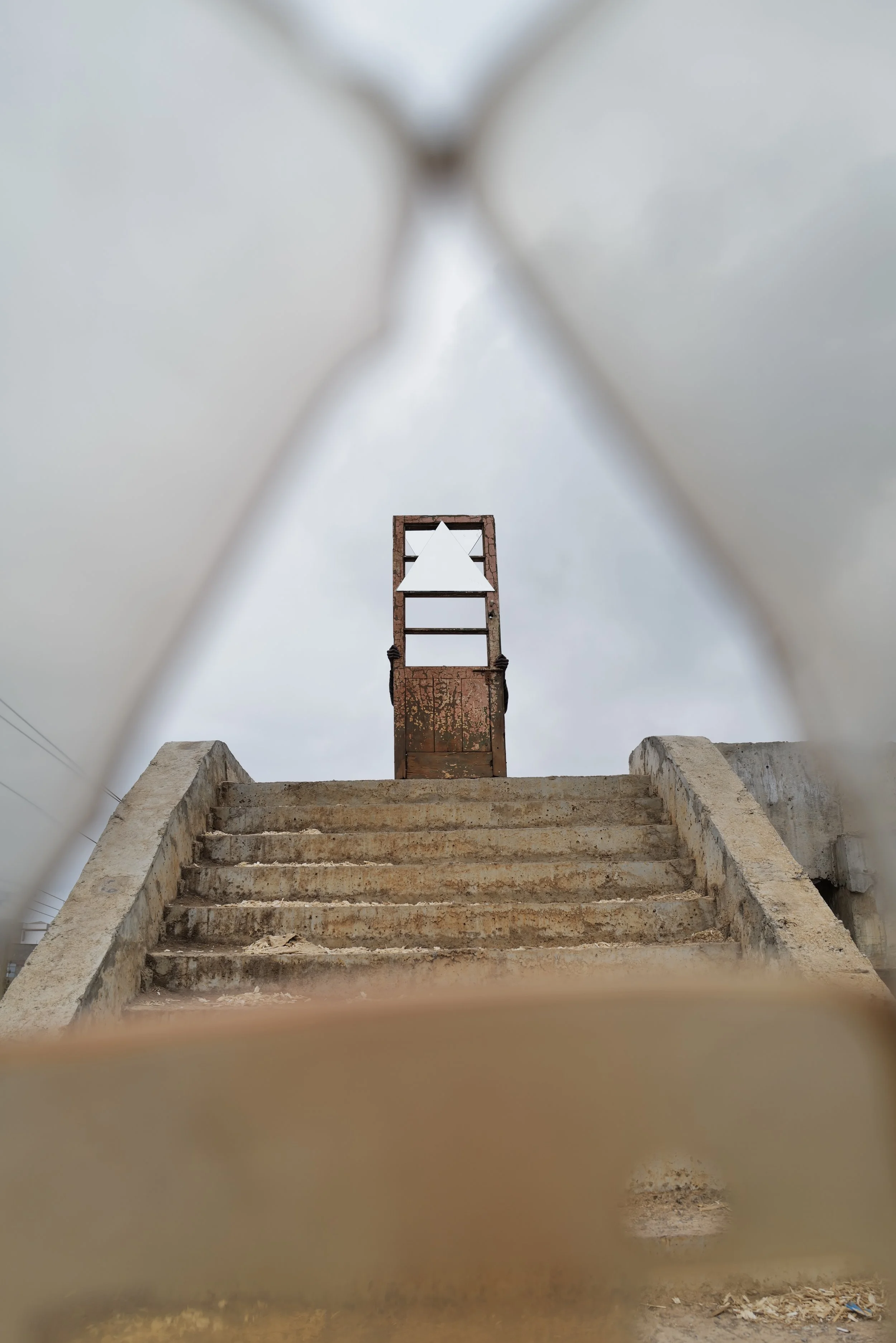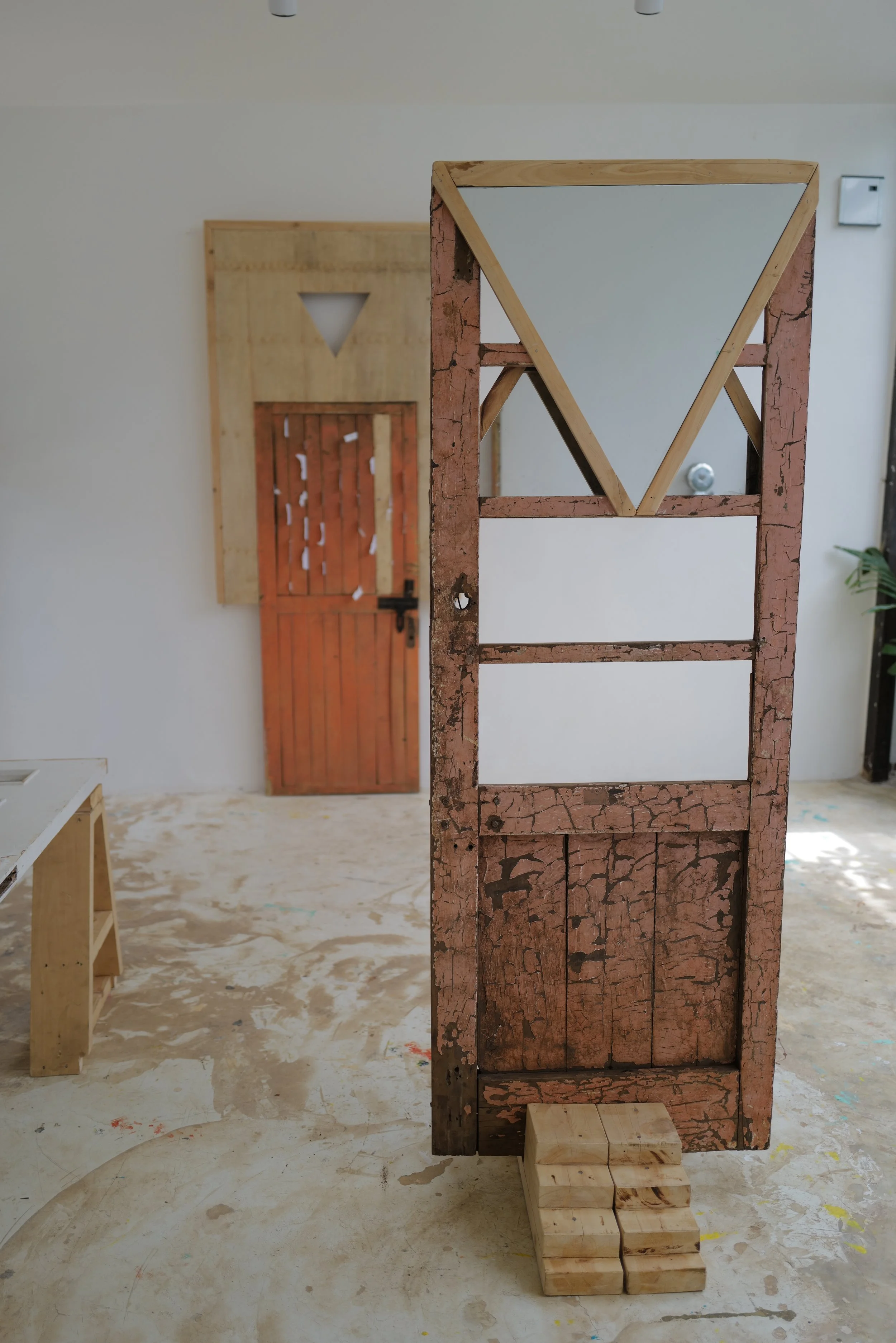 Materials: Triangular Mirrors, Reclaimed Ancient Door, Pyramid Structure Floor Suspension