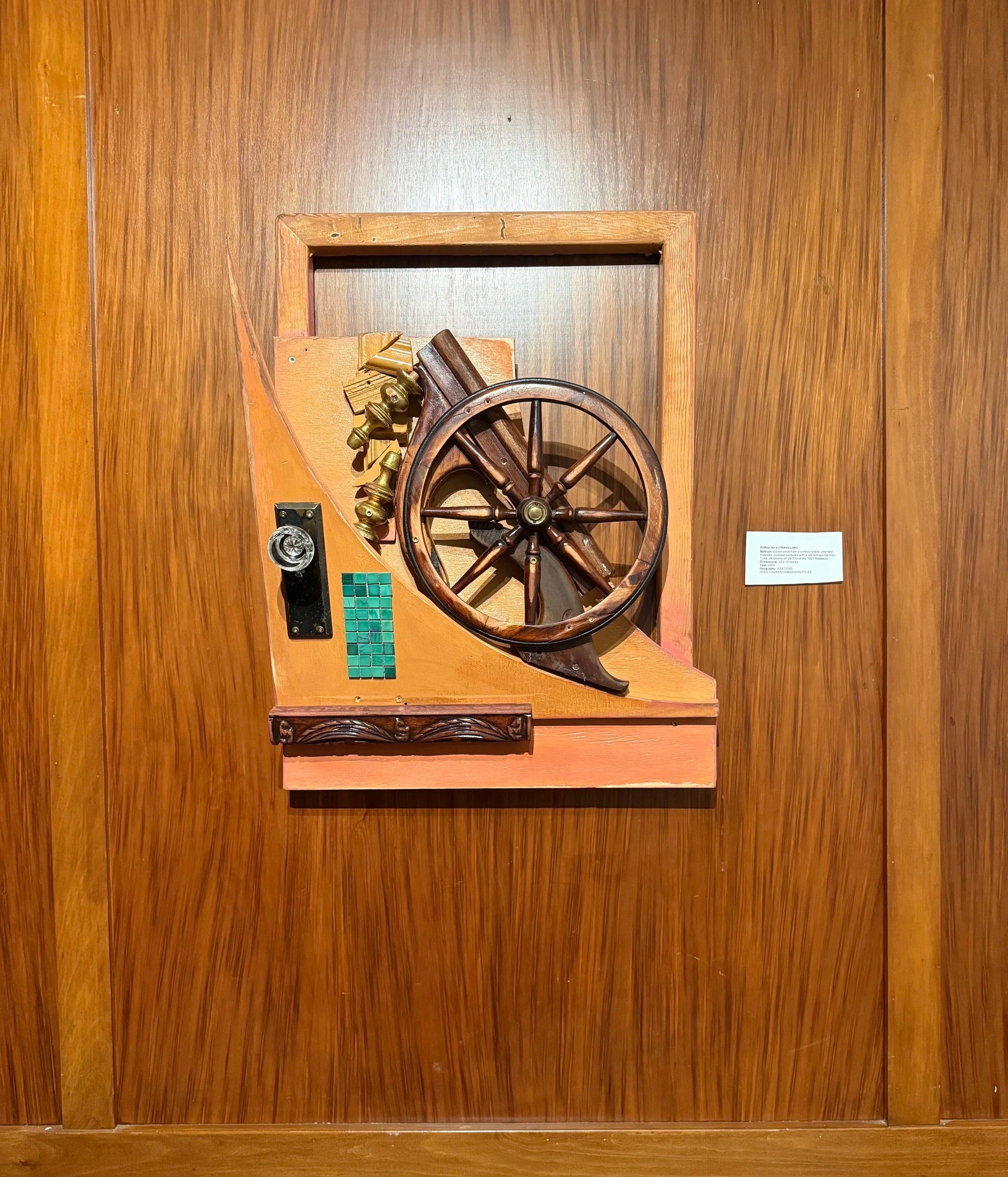 Medium: Found wood from a window shade, inherited materials, oxidized hardware with a old railroad nail from Tulsa, Oklahoma on the Site of the 1921 Massacre.