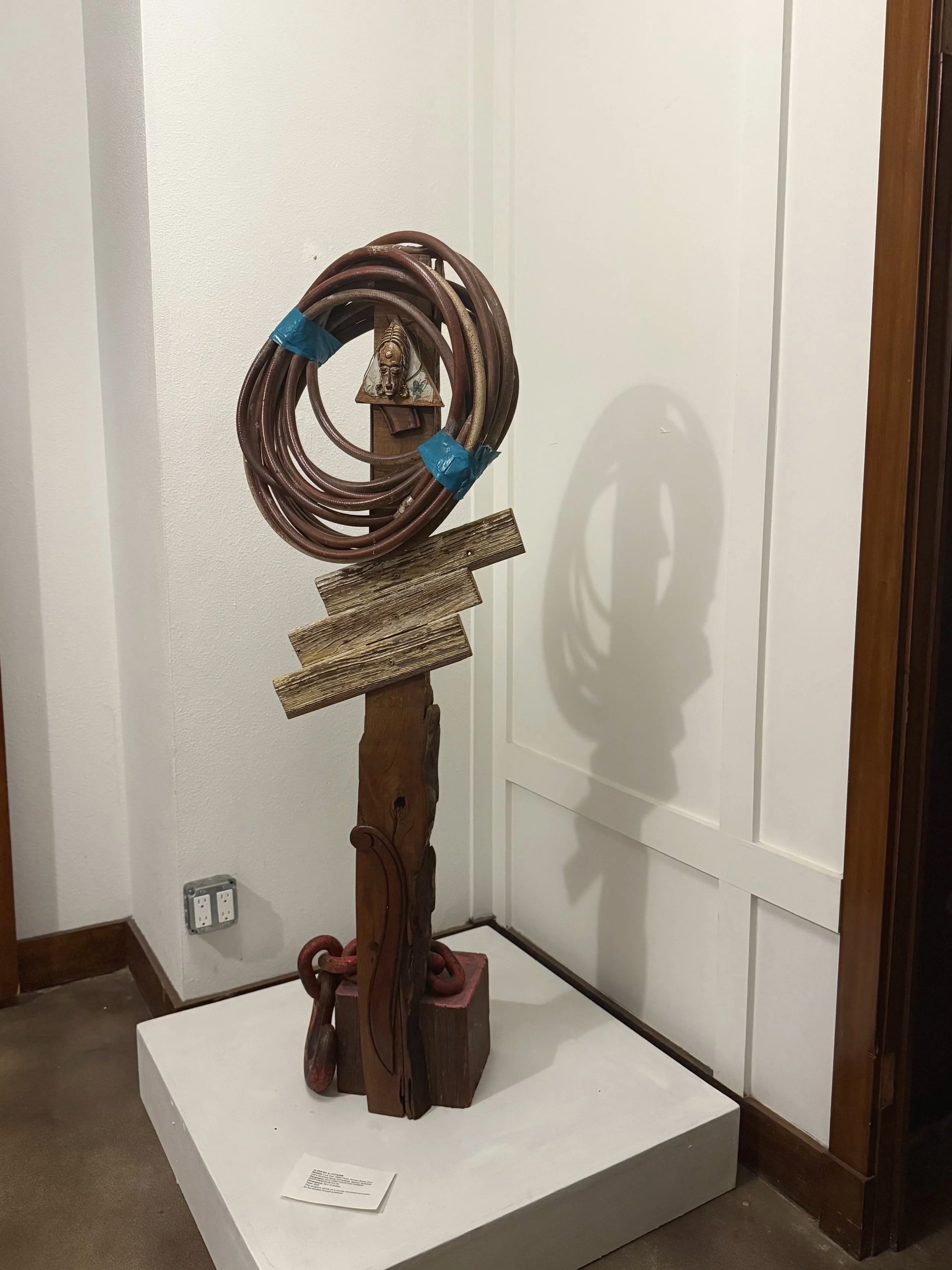 Medium: Live Oak, Water Hose, Ancient Siding from Hall’s ancestral family Homestead, layered remnants